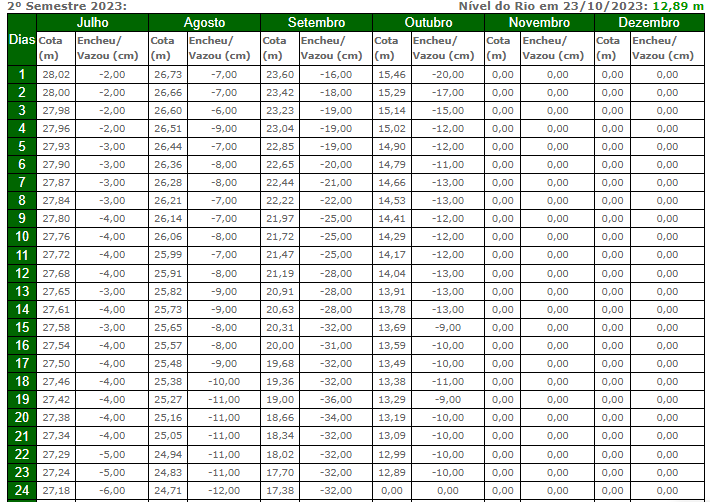 O nível do Solimões atingiu em Manacapuru a cota de 3,81 m em 17 de outubro, ultrapassando a vazante de 2010 (3,92 m) e continua em processo de recessão com descidas médias diárias de 10 cm. Os níveis apontados nesta calha estão próximo do intervalo das mínimas da série histórica de dados.