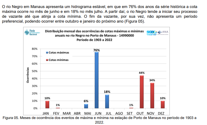 O último boletim divulgado pelo Serviço Geológico do Brasil (SGB/CPRM) destaca que, apesar de não haver um período exato, a maioria das vazantes do rio Negro registraram suas cotas mínimas no mês de outubro, antes de iniciar o processo de cheia novamente.