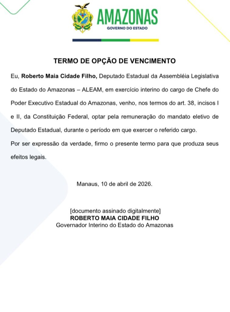 O governador interino Roberto Cidade (UB) formalizou, neste sábado, 11, a decisão de não acumular salários durante o período à frente do Executivo estadual. Em ofício encaminhado à Assembleia Legislativa do Amazonas (ALE-AM), ele informou que permanecerá recebendo a remuneração de deputado estadual, abrindo mão do subsídio de governador.