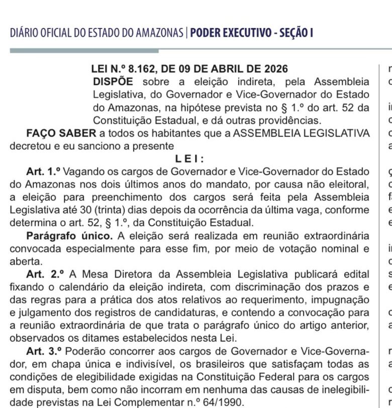 O governador interino Roberto Cidade (UB) sancionou a lei que estabelece as regras básicas da eleição indireta que vai escolher o novo governador e vice-governador do Amazonas, para exercer o mandato tampão. O texto foi aprovado pela Assembleia Legislativa do Estado do Amazonas (ALE-AM) e divulgado no Diário Oficial do Estado do Amazonas (DOE-AM) nessa quinta-feira, 09. As votações devem ocorrer em sessão extraordinária no dia 04 de maio.