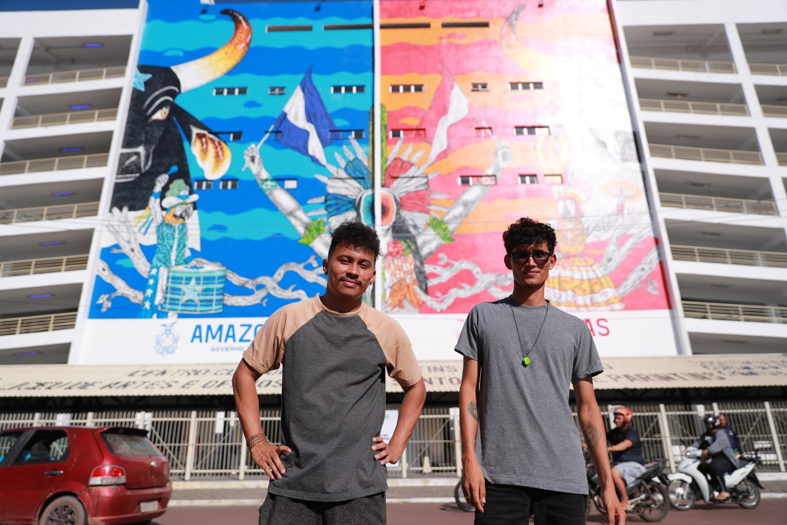 A principal obra está na fachada do Centro Cultura de Parintins – Bumbódromo, que se transformou em um mural gigante, com quase 800 metros quadrados. Intitulada “Vitória da Cultura Popular”, a pintura é assinada pela dupla de artistas parintinenses Curumiz, composta por Alziney Pereira e Kemerson Freitas.