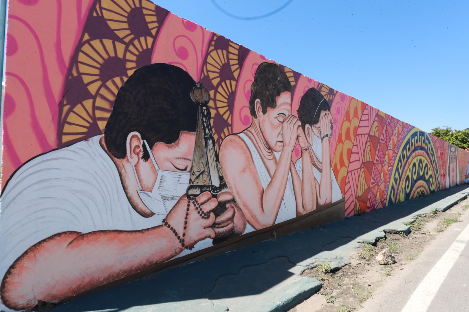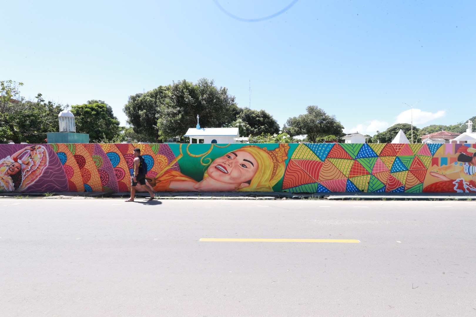 Para além das ruas principais, rota da maioria dos turistas que vão a Parintins, o Roteiro das Artes levou novos ares também para áreas de bairros mais distantes do agito da Ilha. É o caso do muro da Mini Vila Olímpica da cidade, localizado no bairro Palmares.