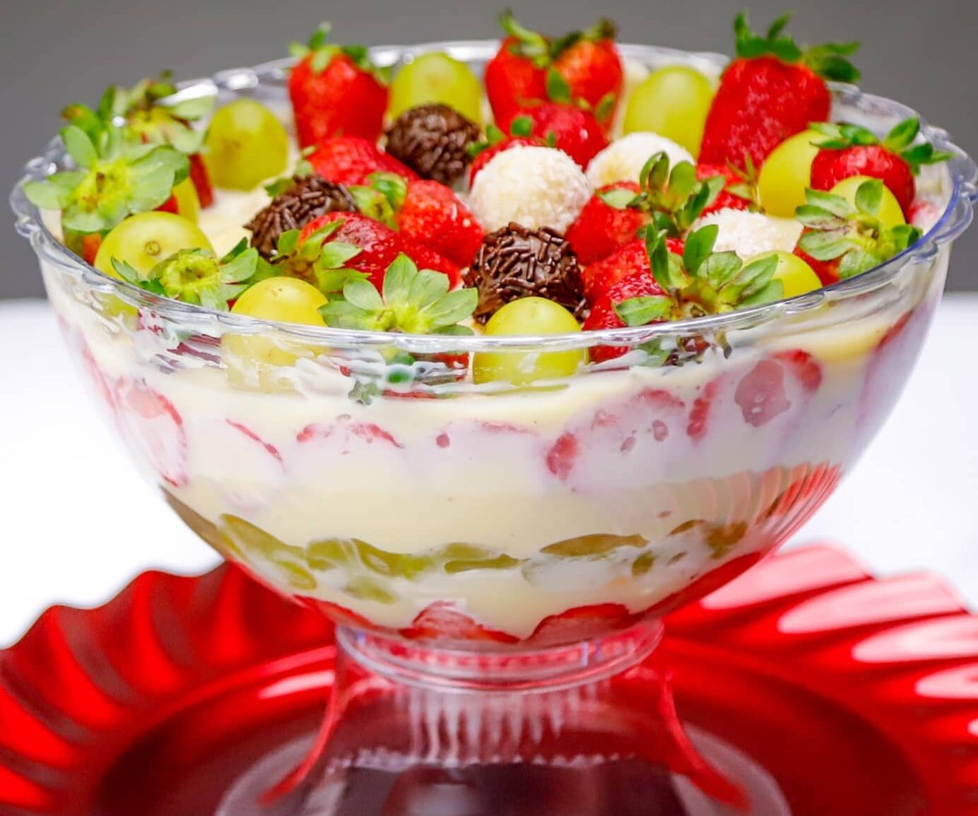 -A primeira camada é formada pelo creme branco e depois vem as frutas, o pudim e a última camada, ponha o chantilly – se quiser, e enfeite com os restantes das frutas não utilizadas nas camadas. O toque final fica por conta da sua criatividade. A Nelinha optou por brigadeiros e frutas.