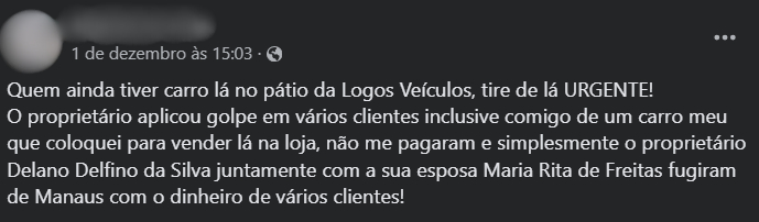 Em outro relato na Internet, uma mulher afirma que o dono da empresa e sua esposa saíram de Manaus, levando o dinheiro das pessoas.