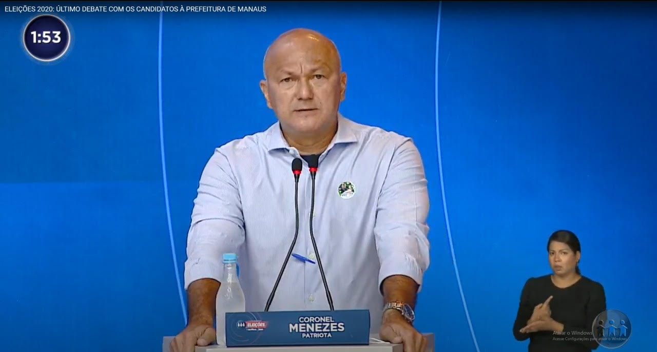 Com mais de 100 mil votos, o candidato à Prefeitura de Manaus, Coronel Menezes (Patriota), esclarece que não irá apoiar nenhum dos dois candidatos Amazonino Mendes (Podemos) e David Almeida (Avante), no segundo turno das eleições municipais. Ele se manterá neutro. Menezes informa, ainda, que recebeu ligação do ex-vice-governador Samuel Ranam, nesta segunda-feira, 16/11, para uma conversa informal e foi encontrá-lo.