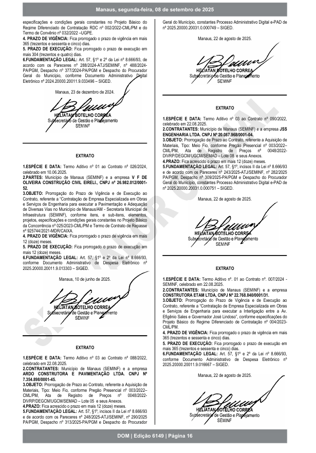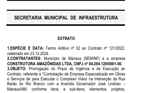 No extrato da Amazônidas Ltda, a empresa recebeu um segundo termo aditivo ao contrato 121/2022 para execução das obras do Complexo Viário na Interseção da Rua Barão do Rio Branco com a Avenida José Lindoso, a chamada Avenida das Torres. Já o contrato da V F de Oliveira Construção Civil recebeu seu primeiro aditivo para continuidade de serviços de pavimentação “e adequação de diversas vias no Município de Manaus”, descrição condizente com o programa Asfalta Manaus.