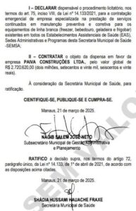 A dispensa foi fundamentada no artigo 75, inciso VIII, da Lei nº 14.133/2021, que permite a contratação sem licitação em casos de emergência ou quando há necessidade de continuidade de serviços essenciais. O documento foi assinado pelo subsecretário municipal de Gestão Administrativa e Planejamento, na Gib Salem José Neto, e ratificado pela secretária municipal de Saúde, Shadia Hussami Hauache Fraxe.