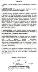 A empresa Caiçara Ltda., identificada pelo CNPJ 44.635.732/0001-23, tem como sócio-administrador Anelson Brito de Souza. O contrato foi assinado pelo secretário municipal de Educação, Valquindar Ferreira Mar Júnior, e publicado em Diário Oficial.