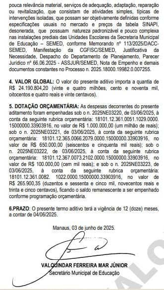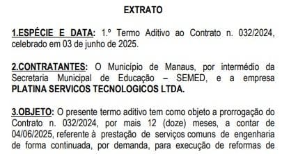 A Prefeitura de Manaus, por meio da Secretaria Municipal de Educação (Semed), prorrogou por mais 12 meses dois contratos milionários que somam R$ 27 milhões, com as empresas Platina Serviços Tecnológicos Ltda. e a Paiva Construções Ltda. Os acordos são para a prestação de serviços continuados de reformas e instalação de bebedouros na rede pública de ensino da capital amazonense. A decisão foi formalizada e publicada no Diário Oficial do Município (DOM) dessa segunda-feira (7).