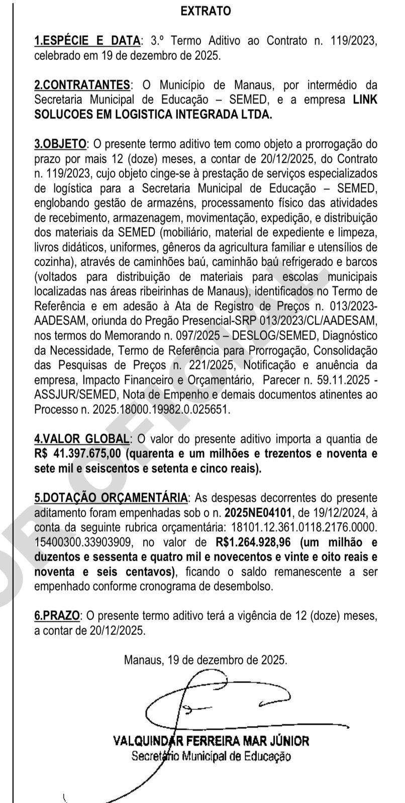 De acordo com os extratos contratuais, a Semed prorrogou o Contrato nº 119/2023, firmado com a empresa Link Soluções em Logística Integrada Ltda., pelo valor global de R$ 41.397.675,00. O aditivo tem vigência de 12 meses e prevê a continuidade da prestação de serviços especializados de logística, incluindo gestão de armazéns, recebimento, armazenamento, movimentação, expedição e distribuição de materiais destinados à rede municipal de ensino, como mobiliário, material didático, uniformes e gêneros alimentícios.