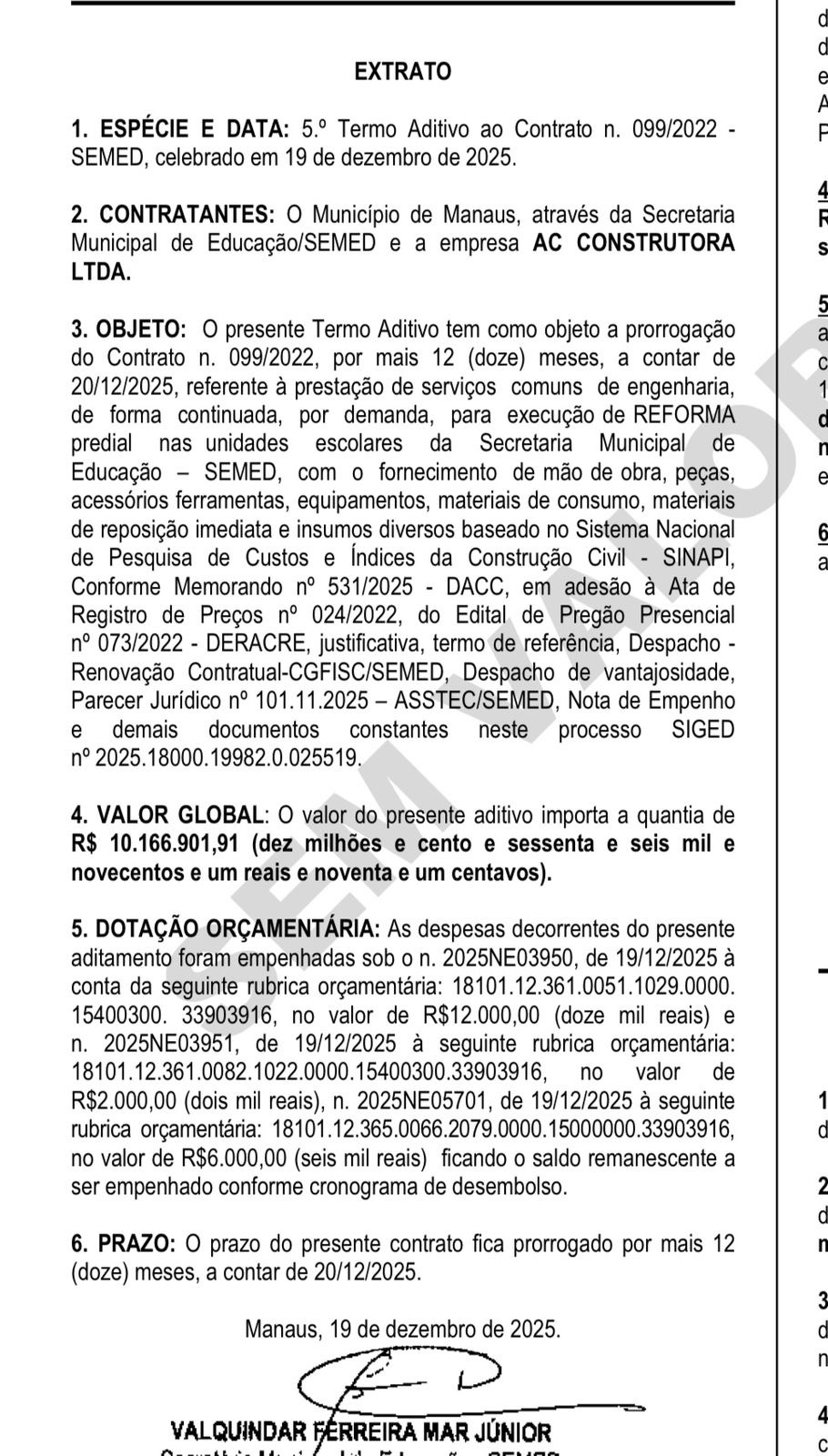 A Prefeitura de Manaus, por meio da Secretaria Municipal de Educação (Semed), renovou dois contratos administrativos que somam R$ 51,5 milhões, conforme extratos publicados no Diário Oficial do Município (DOM). Os aditivos, com vigência de 12 meses a partir de 20 de dezembro de 2025, prevê a continuidade de serviços de logística para distribuição de materiais da rede municipal de ensino e de serviços de engenharia voltados à reforma e manutenção de unidades escolares, firmados com as empresas Link Soluções em Logística Integrada Ltda. e AC Construtora Ltda.