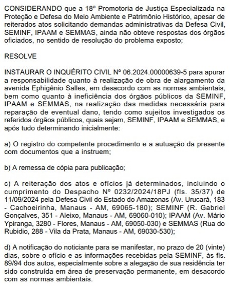 O Ministério Público do Amazonas (MP-AM), por meio da 18ª Promotoria de Justiça Especializada na Proteção e Defesa do Meio Ambiente e Patrimônio Histórico, instaurou inquérito civil para apurar a responsabilidade em relação à realização de obra de alargamento da avenida Ephigênio Salles. A informação consta no Diário Oficial do MP-AM da última quinta-feira (6).