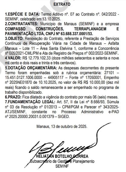 Os contratos renovados fazem parte de diferentes lotes do programa Asfalta Manaus e referem-se à continuidade dos serviços de recuperação viária em diversas zonas da cidade. Um dos aditivos, o da empresa Compasso Construções, que recebeu R$ 12.779.102,33, aparece no extrato assinado pela Subsecretaria de Gestão e Planejamento da Seminf, datado de 13 de outubro de 2025, referente ao Lote 11, na área de Santa Etelvina, zona Norte.