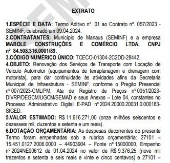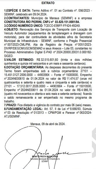 A prefeitura de Manaus, por meio da Secretaria Municipal de Infraestrutura (Seminf), renovou quatro contratos que somam mais de R$ 60 milhões para prestação de serviços para o programa Asfalta Manaus. Os gastos com o programa de asfaltamento já ultrapassaram R$ 1,1 bilhão, desde o lançamento em abril de 2022. Os extratos dos contratos constam no Diário Oficial do Município (DOM) da terça-feira (21).