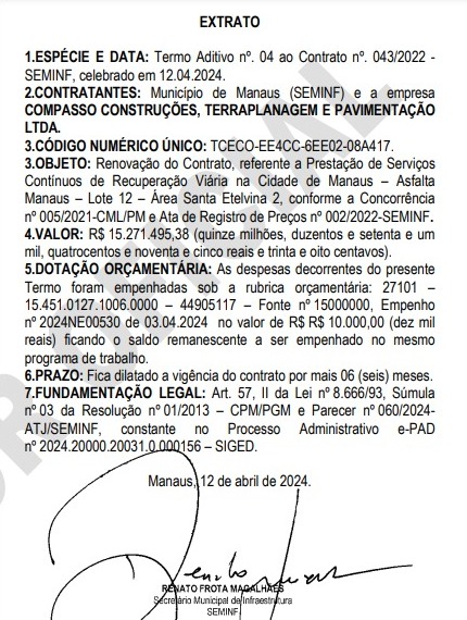 O contrato que possui valor de R$ 15.271.495,38, foi renovado por mais seis meses, e tem como objeto a prestação de serviços contínuos de recuperação viária na cidade de Manaus, na área do bairro Santa Etelvina 2, zona Norte.