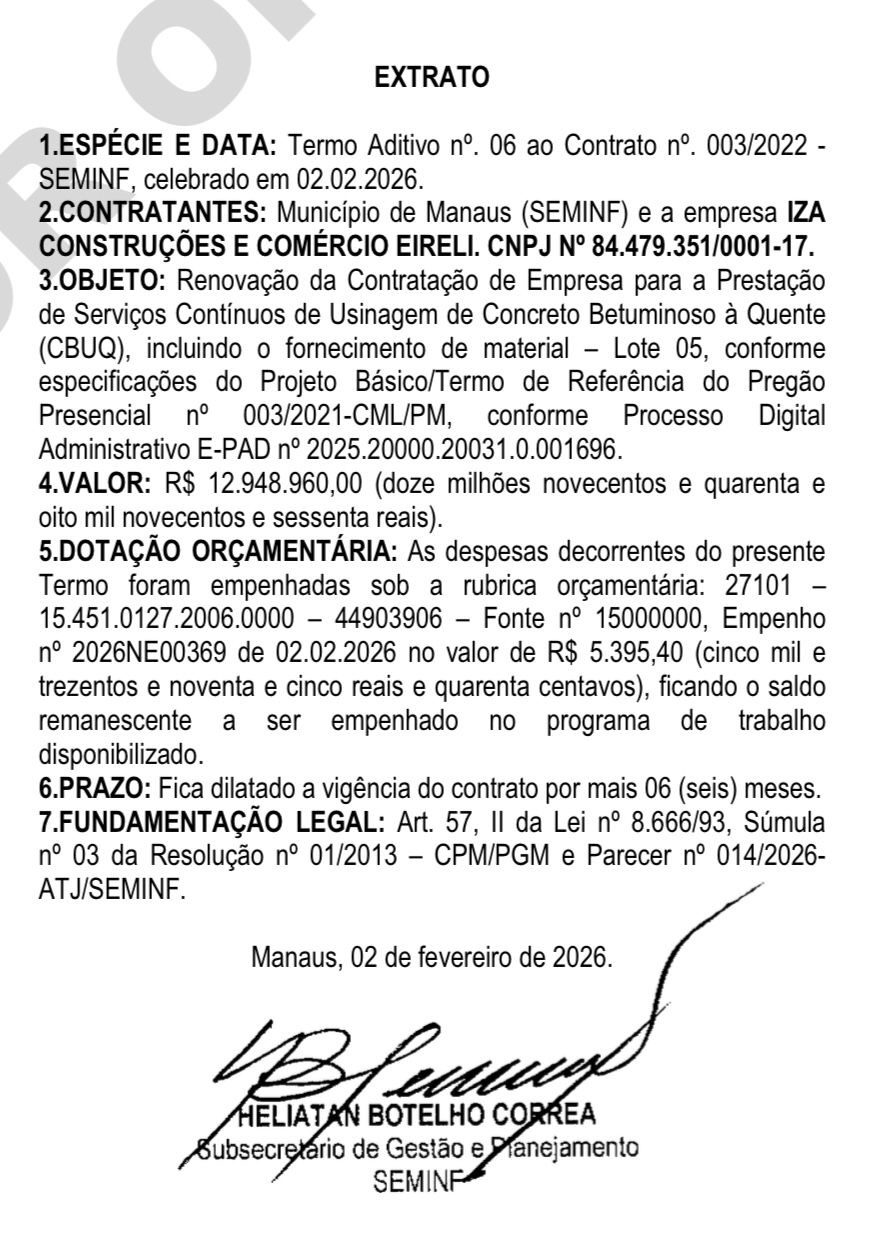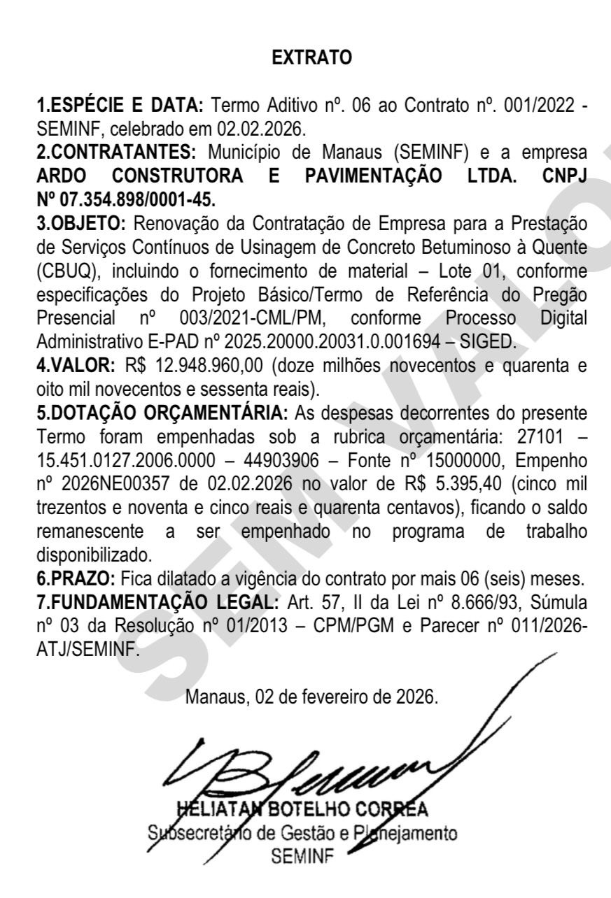 A Prefeitura de Manaus, por meio da Secretaria Municipal de Infraestrutura (Seminf), renovou por mais seis meses, três contratos para a prestação de serviços contínuos de usinagem de Concreto Betuminoso Usinado a Quente (CBUQ), utilizado em obras de pavimentação e manutenção viária na capital. Os termos aditivos, publicados no Diário Oficial do Município (DOM) da última sexta-feira, 27, são datados de 2 de fevereiro de 2026 e contemplam as empresas Ardo Construtora e Pavimentação Ltda, Construtora ETAM Ltda e IZA Construções e Comércio Eireli. Cada contrato tem valor global de R$ 12.948.960,00.