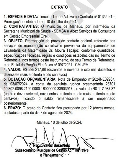 Já a Abex teve os serviços prorrogados para a manutenção corretiva e preventiva de equipamentos de Lavanderia da Maternidade Dr. Moura Tapajóz, no valor de R$ 298.217,88.