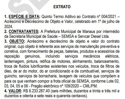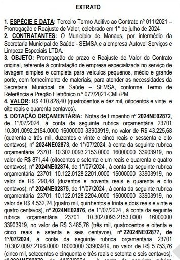 A prefeitura de Manaus, por meio da Secretaria Municipal de Saúde (Semsa), prorrogou e reajustou cerca de noves contratos que somam R$ 40,8 milhões. Entre os serviços estão locação de unidades móveis, lavagem de veículos pequenos e outros serviços. Os extratos foram divulgados no Diário Oficial do Município (DOM) da última sexta-feira (23).