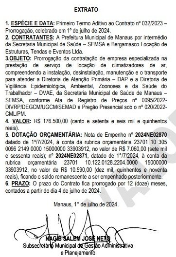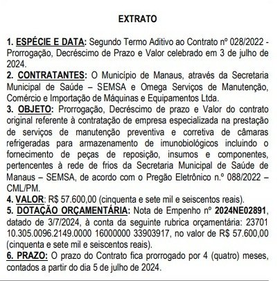 A Omega Serviços teve dois contratos com a pasta prorrogados. Um no valor de R$ 5.246.786,40 e R$ 57.600,00. A empresa vai prestar serviços continuados de manutenção preventiva, corretiva e instalações de condicionadores de ar para atender todos os Estabelecimentos Assistenciais de Saúde (EAS), Sedes Administrativas e programas da Semsa. Já no outro contrato, a empresa vai prestar serviços de manutenção preventiva e corretiva de câmaras refrigeradas para armazenamento de imunobiológicos incluindo o fornecimento de peças de reposição, insumos e componentes, pertencentes à rede de frios da pasta.