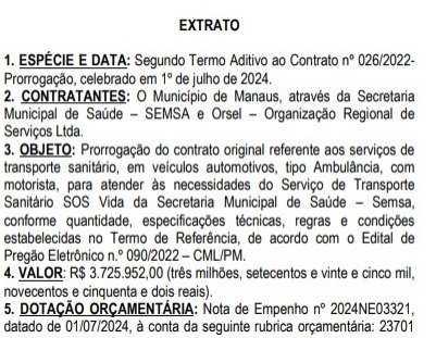 Por R$ 3.725.952,00, a secretaria prorrogou o contrato com a Orsel para serviços de transporte sanitário, em veículos automotivos, tipo ambulância, com motorista, para atender as necessidades do Serviço de Transporte Sanitário SOS Vida.