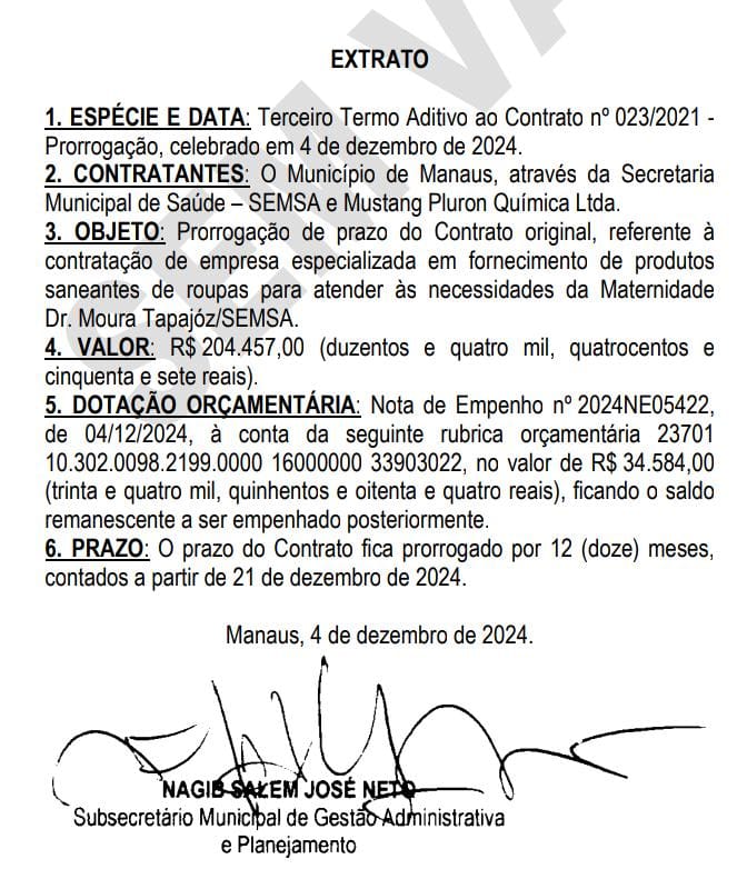 Já no Terceiro Termo Aditivo ao Contrato nº 023/2021, a Mustang Pluron presta serviço especializado em fornecimento de produtos saneantes de roupas para atender às necessidades da Maternidade Dr. Moura Tapajóz, pelo valor de R$ 204.457,00 (duzentos e quatro mil, quatrocentos e cinquenta e sete reais).