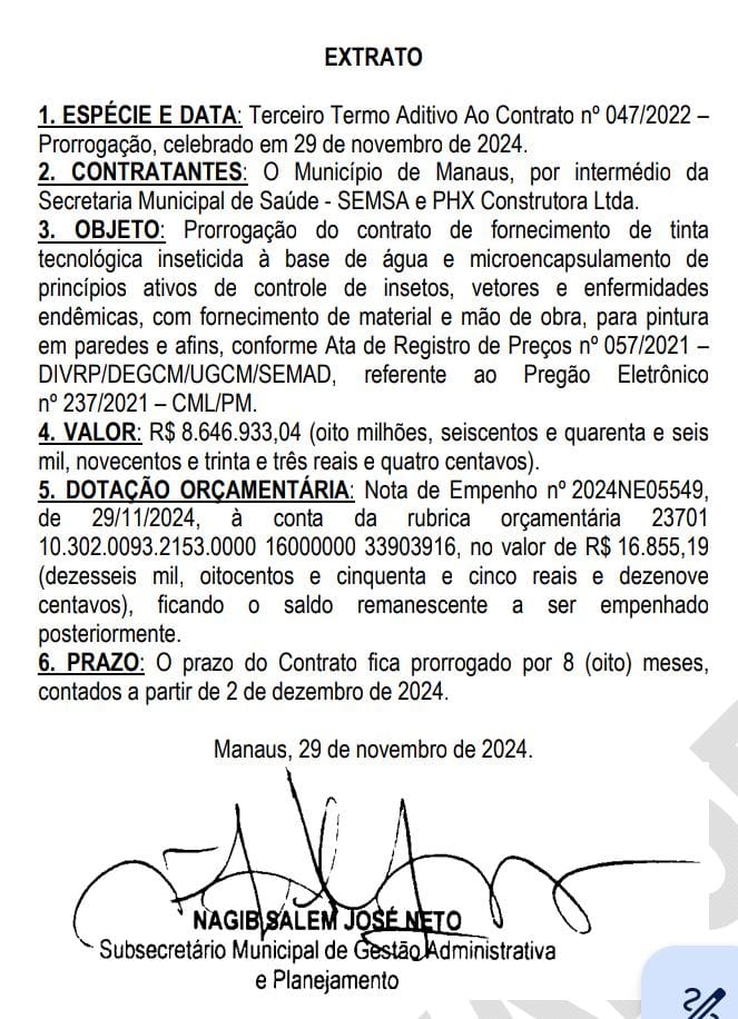 A PHX Construtora, chega ao Terceiro Termo Aditivo ao Contrato nº 047/2022 com valor global de R$ 8.646.933,04 (oito milhões, seiscentos e quarenta e seis mil, novecentos e trinta e três reais e quatro centavos), para continuar fornecendo tinta tecnológica inseticida à base de água e microencapsulamento de princípios ativos de controle de insetos, vetores e enfermidades endêmicas, com fornecimento de material e mão de obra, para pintura em paredes e afins.
