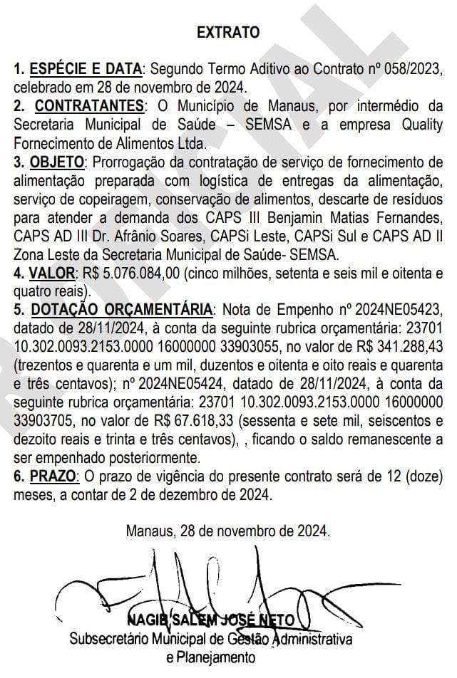 A Quality Fornecimento de Alimentos, chega ao Segundo Termo Aditivo ao Contrato nº 058/2023, no valor global de R$ 5.076.084,00 (cinco milhões, setenta e seis mil e oitenta e quatro reais), para fornecimento de alimentação preparada com logística de entregas de alimentação, serviço de capoiragem, conservação de alimentos, descarte de resíduos para atender a demanda dos CAPS III Benjamin Matias Fernandes, CAPS AD III Dr. Afrânio Soares, CAPSi Leste, CAPSi Sul e CAPS AD II zona Leste da Semsa.
