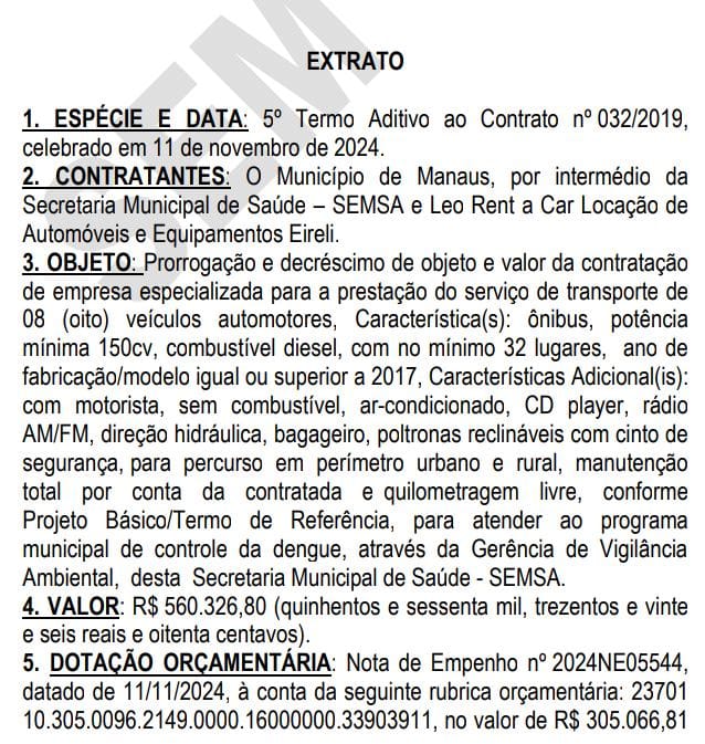 Já a Leo Rent a Car, que possui diversos contratos com a prefeitura de Manaus e esteve envolta em polêmica de pagamentos à primeira-dama, chega ao 5º Termo Aditivo ao Contrato nº032/2019. Pelo valor global de R$ 560.326,80 (quinhentos e sessenta mil, trezentos e vinte e seis reais e oitenta centavos), vai prestar serviço de transporte de oito veículos automotores, do tipo ônibus, potência mínima 150cv, combustível diesel, com no mínimo 32 lugares, ano de fabricação/modelo igual ou superior a 2017. Além disso, os veículos devem contar com motorista, ar-condicionado, CD player, rádio AM/FM, direção hidráulica, bagageiro, poltronas reclináveis com cinto de segurança, para percurso em perímetro urbano e rural, para atender ao programa municipal de controle da dengue.