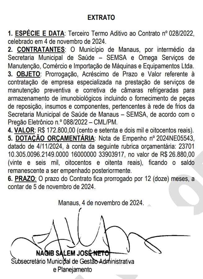 A Omega Serviços de Manutenção, que já está no Terceiro Termo Aditivo ao Contrato nº 028/2022, permanece prestando serviços de manutenção preventiva e corretiva de câmaras refrigeradas para armazenamento de imunobiológicos incluindo o fornecimento de peças de reposição, insumos e componentes, pertencentes à rede de frios da Semsa. O valor global é de R$ 172.800,00 (cento e setenta e dois mil e oitocentos reais), pelo período de 12 meses.
