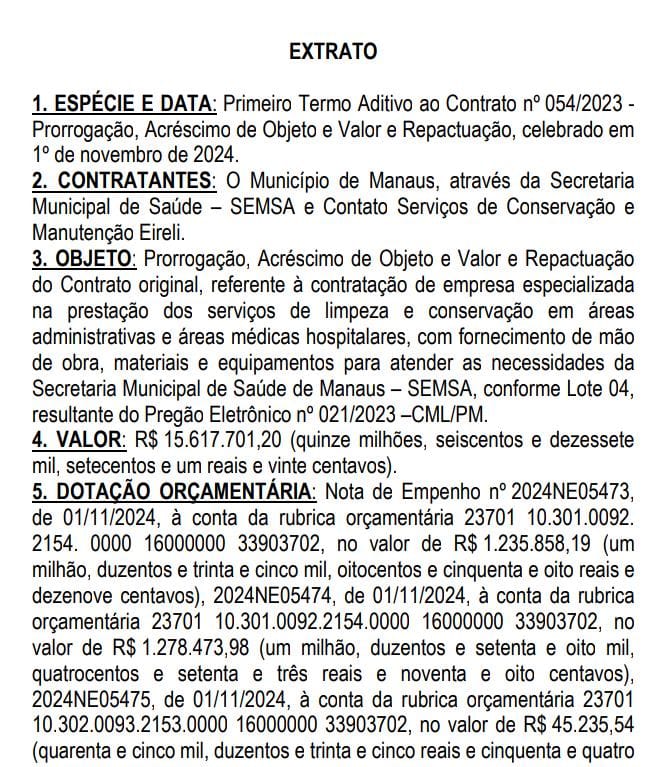 Por meio do Primeiro Termo Aditivo ao Contrato nº 054/2023, a Contato Serviços de Conservação vai continuar prestando serviços de limpeza e conservação em áreas administrativas e áreas médicas hospitalares, com fornecimento de mão de obra, materiais e equipamentos para atender as necessidades da Semsa. Além da prorrogação, houve acréscimo de objeto e valor e repactuação do contrato original.
