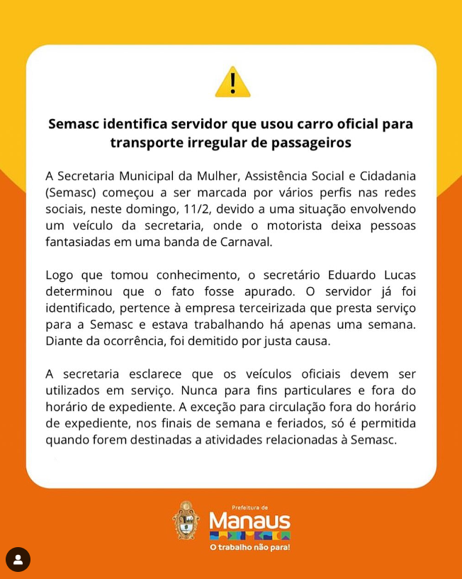 Um servidor terceirizado da Secretaria Municipal da Mulher, Assistência Social e Cidadania (Semasc), da Prefeitura de Manaus, foi demitido após ser flagrado transportando foliões para uma banda de carnaval nas proximidades da Arena da Amazônia usando um carro da própria secretaria. O nome do servidor não foi divulgado.