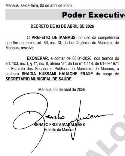 Em mais uma série de mudanças no secretariado da Prefeitura de Manaus, Shádia Fraxe foi exonerada do cargo de secretária municipal de Saúde pelo prefeito de Manaus, Renato Junior (Avante). A exoneração foi publicada no Diário Oficial do Município (DOM), neste sábado, 04, mas corresponde ao dia 03 de abril. O dia 04 de abril é o último do período de desincompatibilização para pessoas que, conforme a legislação eleitoral, precisam se afastar do cargo para concorrer a um cargo eletivo.