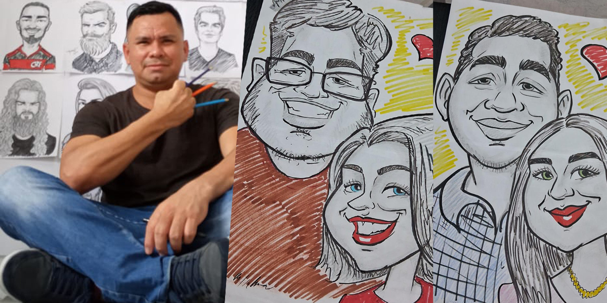 Hoje, após cursos na área da ilustração, ele passou a fazer caricaturas ao vivo em eventos e garante que leva até menos de 5 minutos. “No começo, eu levava uns 20 minutos desenhando a pessoa. Hoje, levo 5 minutos e às vezes até menos”, garante.