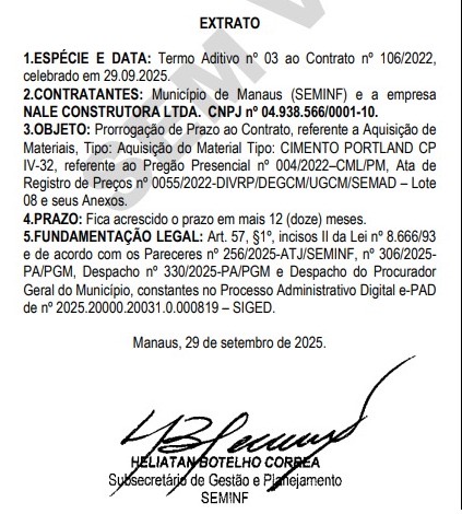 A Prefeitura de Manaus, por meio da Seminf (Secretaria Municipal de Infraestrutura), que está sob o comando do vice-prefeito Renato Júnior (Avante), também secretário da pasta, renovou novamente contratos para aquisição de cimento Portland sem divulgar os valores. Desta vez, foram três prorrogações firmadas com as empresas JSS Engenharia Ltda. (contrato nº 100/2022), Nale Construtora Ltda. (contrato nº 106/2022) e F. S. Horácio Ltda. (contrato nº 103/2022), conforme publicação no Diário Oficial do Município (DOM), da última terça-feira (30).