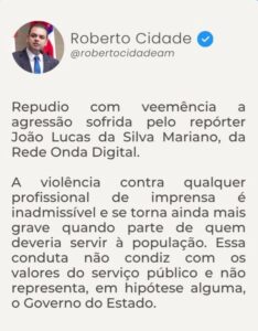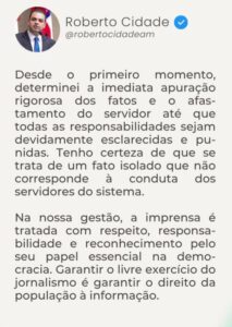 O governador Roberto Cidade, afirmou em seu pronunciamento que repudia qualquer tipo de agressão contra profissionais da imprensa, determinando o acompanhamento institucional do caso.