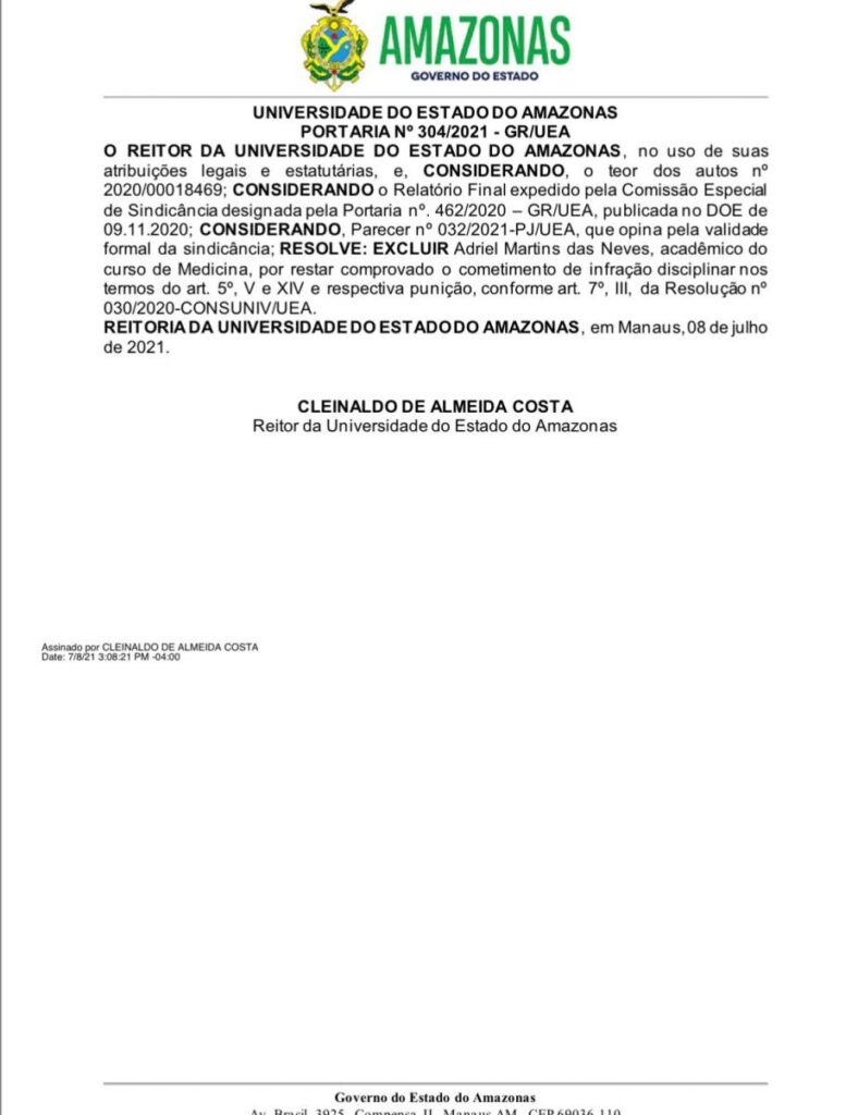 A exclusão ocorreu com base no regimento interno da instituição, que prevê punição para condutas consideradas incompatíveis com a moralidade e a dignidade do ambiente universitário. Com isso, ele não mantinha qualquer vínculo acadêmico que justificasse atuação em plantões ou atividades na rede pública de saúde como estudante ou interno.