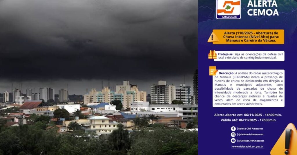 *Da Redação Dia a Dia Notícia A Defesa Civil emitiu alerta para a possibilidade de forte temporal em Manaus e em municípios do interior do Amazonas nas próximas horas. A previsão indica chuvas intensas acompanhadas de descargas elétricas e rajadas de vento, com risco de alagamentos e enxurradas em áreas vulneráveis. Imagens do radar meteorológico […]