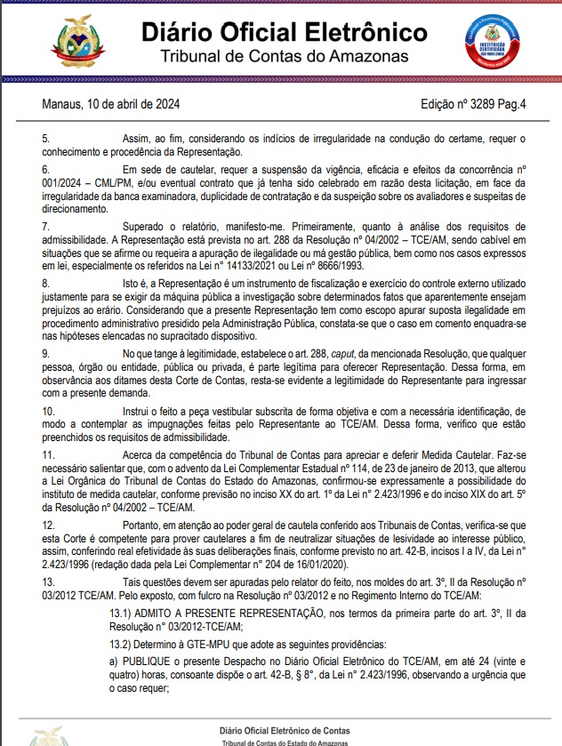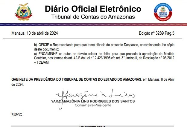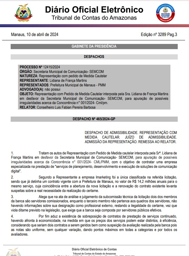 O Tribunal de Contas do Amazonas (TCE-AM) acatou um pedido de Medida Cautelar contra a prefeitura de Manaus por possíveis irregularidades em processo de licitação da Secretaria Municipal de Comunicação (Semcom), onde a empresa Imarketing, do empresário Durango Duarte, foi a única classificada ao mesmo tempo que já possui outro contrato em vigência. A informação foi divulgada no Diário Oficial Eletrônico do TCE-AM nº 3289 da quarta-feira (10).