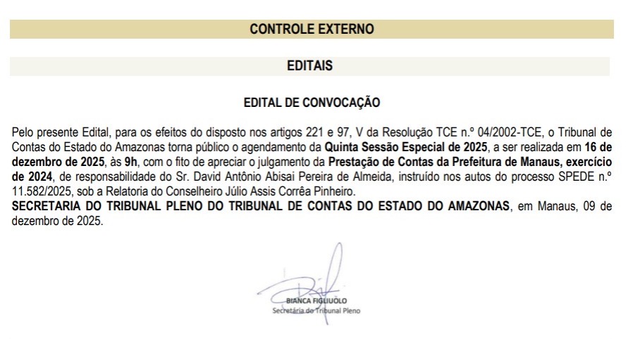 O Tribunal de Contas do Estado do Amazonas (TCE-AM) agendou para próxima terça-feira (16), às 9h, o julgamento da Prestação de Contas da Prefeitura de Manaus referente ao exercício financeiro de 2024, sob responsabilidade do prefeito David Almeida (Avante). A convocação foi publicada no Diário Oficial do TCE-AM, nesta terça-feira (9).
