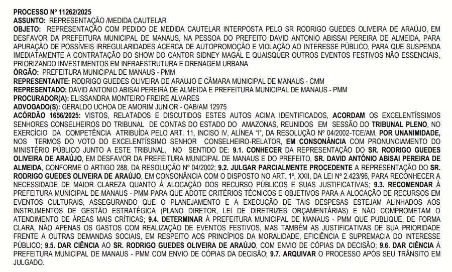 O Tribunal de Contas do Estado do Amazonas (TCE-AM) julgou parcialmente procedente a representação do vereador Rodrigo Guedes (Progressistas) contra o prefeito David Almeida (Avante), que questiona possíveis irregularidades por autopromoção e violação ao interesse público na contratação do show do cantor Sidney Magal e outros eventos festivos. A Corte determinou maior transparência na destinação dos recursos públicos e recomendou à Prefeitura de Manaus que priorize investimentos em infraestrutura e drenagem urbana, além de estabelecer critérios técnicos e justificativas claras para gastos com eventos culturais. A decisão foi publicada no Diário Oficial do TCE-AM, dessa sexta-feira (17).