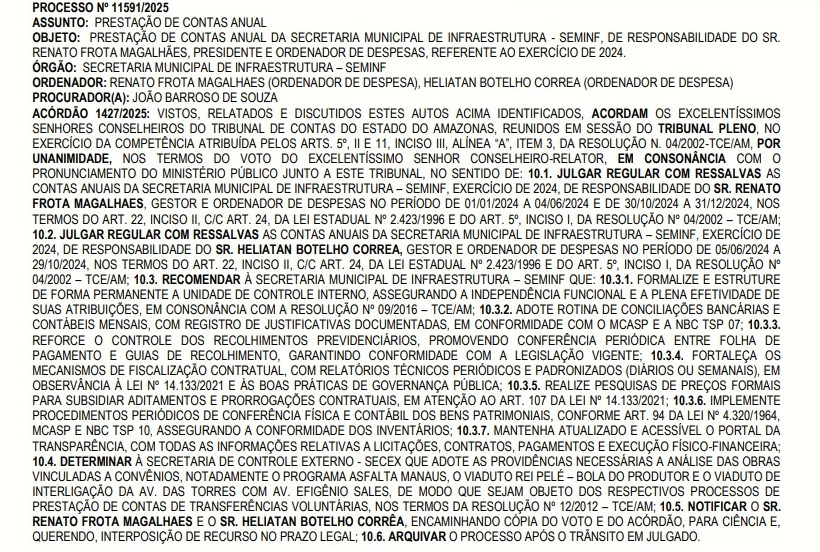 O Tribunal de Contas do Estado do Amazonas (TCE-AM) julgou regulares, mas com ressalvas, as contas da Secretaria Municipal de Infraestrutura (Seminf), referentes ao exercício de 2024. A decisão, relatada pelo conselheiro Érico Desterro e publicada no Diário Oficial do órgão da última sexta-feira (19), envolve o secretário Renato Frota Magalhães e o ordenador de despesas Heliatan Botelho Correa, responsáveis pela pasta em diferentes períodos do ano. O processo está registrado sob nº 11591/2025.