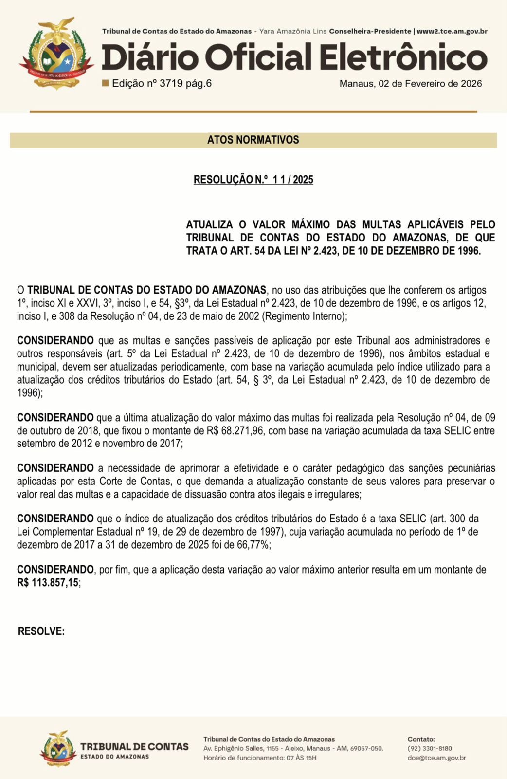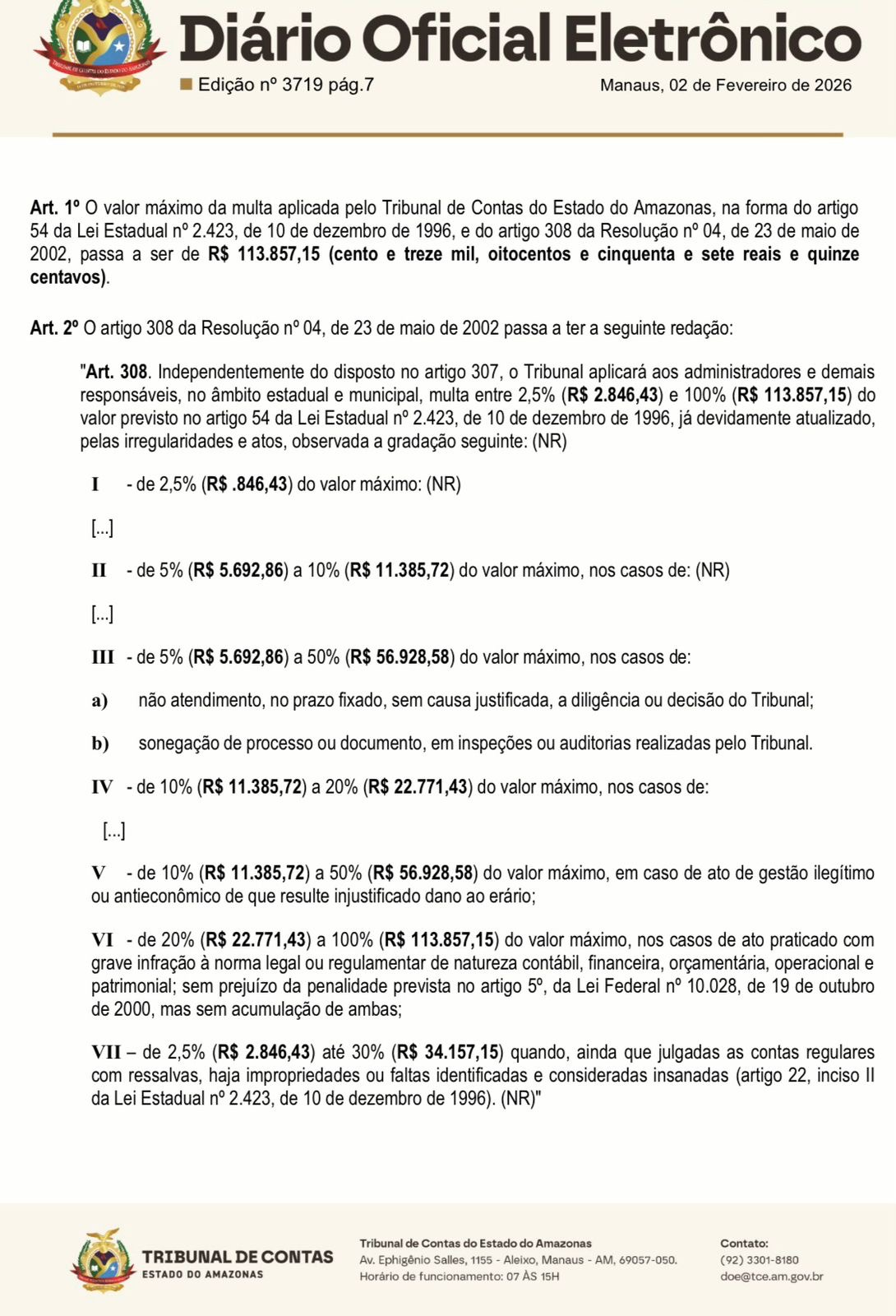 O Tribunal de Contas do Estado do Amazonas (TCE-AM) aumentou o valor máximo das multas que podem ser aplicadas a administradores públicos, como prefeitos, secretários e gestores estaduais e municipais, em caso de irregularidades na gestão de recursos públicos. Com a atualização, o teto da penalidade passou de R$ 68.271,96 para R$ 113.857,15. A mudança consta na Resolução nº 11/2025, publicada no Diário Oficial Eletrônico do TCE-AM, dessa segunda-feira, 02.