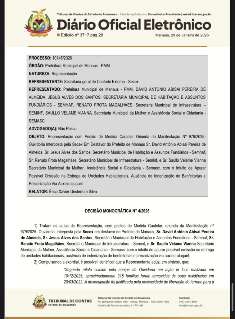 *As informações são do Portal Rios de Notícia, mediante análise de documento oficial emitido pelo TCE-AM e divulgado por meio do Diário Oficial Eletrônico no dia 29 de janeiro de 2026.