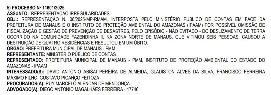 A representação foi interposta pelo Ministério Público de Contas (MPC-AM), que aponta falhas tanto da administração municipal quanto do órgão estadual de proteção ambiental na adoção de medidas preventivas. Segundo o MPC, a tragédia poderia ter sido evitada caso houvesse uma fiscalização mais rigorosa das áreas de risco e ações de gestão efetivas voltadas à prevenção de desastres naturais.