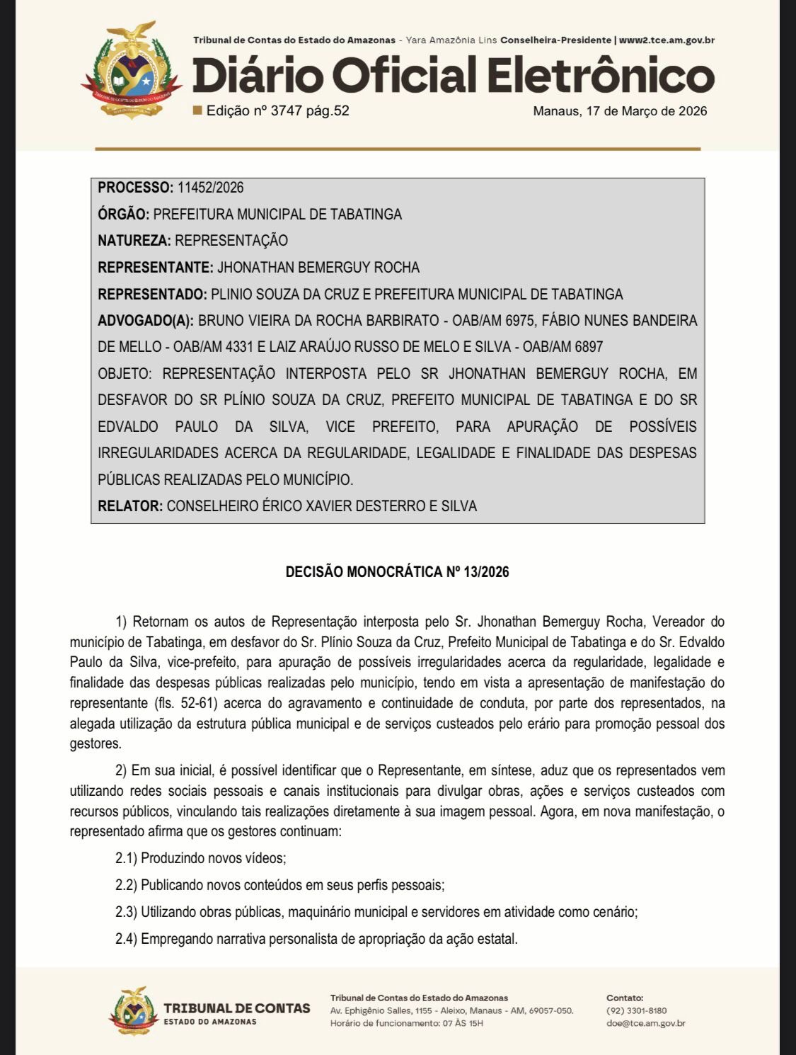 O vereador Jhonathan Bemerguy Rocha (PSD) ingressou com uma representação no Tribunal de Contas do Estado do Amazonas (TCE-AM) contra o prefeito de Tabatinga (a 1.110 quilômetros de Manaus), Plínio Souza da Cruz (Republicanos), e o vice-prefeito Edvaldo Paulo da Silva (MDB), por suposto uso da estrutura pública para produção de conteúdos em redes sociais com fins de promoção pessoal. Em decisão monocrática, o conselheiro relator Érico Xavier Desterro e Silva determinou que os gestores sejam notificados para se manifestarem no prazo de cinco dias antes da análise de eventual medida cautelar.