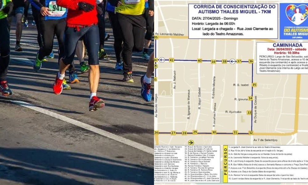 No domingo pela manhã, a corrida de conscientização do autismo terá um percurso de sete quilômetros, com largada na Rua José Clemente, ao lado do Teatro Amazonas. O trajeto seguirá pela Rua 10 de Julho (faixa da esquerda) em direção à avenida Getúlio Vargas, avenida Getúlio Vargas (à esquerda, na contramão), avenida Leonardo Malcher (à esquerda, faixa da esquerda), Rua Luiz Antony (à esquerda, faixa da esquerda, passando para a faixa da direita após a Rua 10 de Julho) e Rua Governador Vitório (faixa da direita), acessando a Rua Bernardo Ramos e contornando a Praça Dom Pedro II.