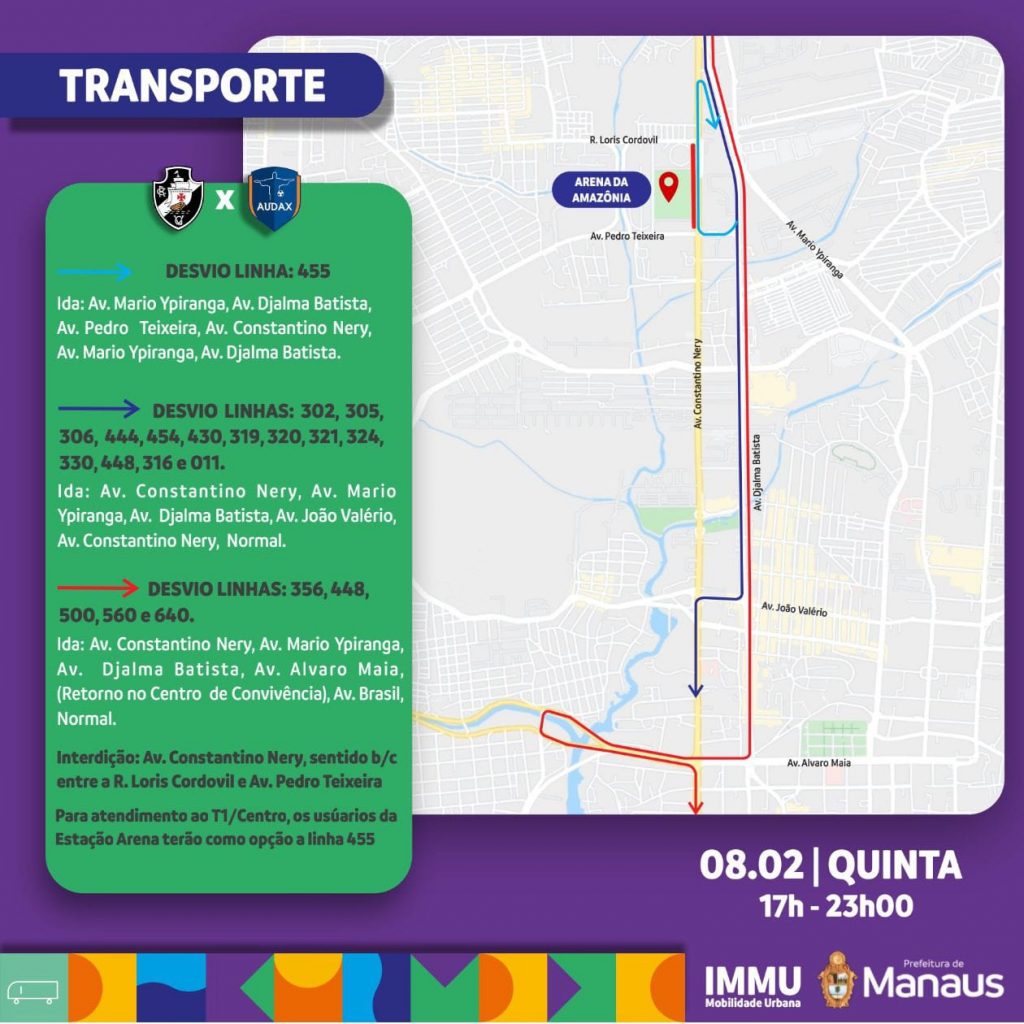 Os desvios das linhas 356, 448, 500, 560 e 640 seguirão pela avenida Constantino Nery, avenida Mário Ypiranga, avenida Djalma Batista, avenida Álvaro Maia, (retorno no Centro de Convivência), avenida Brasil, normalmente.