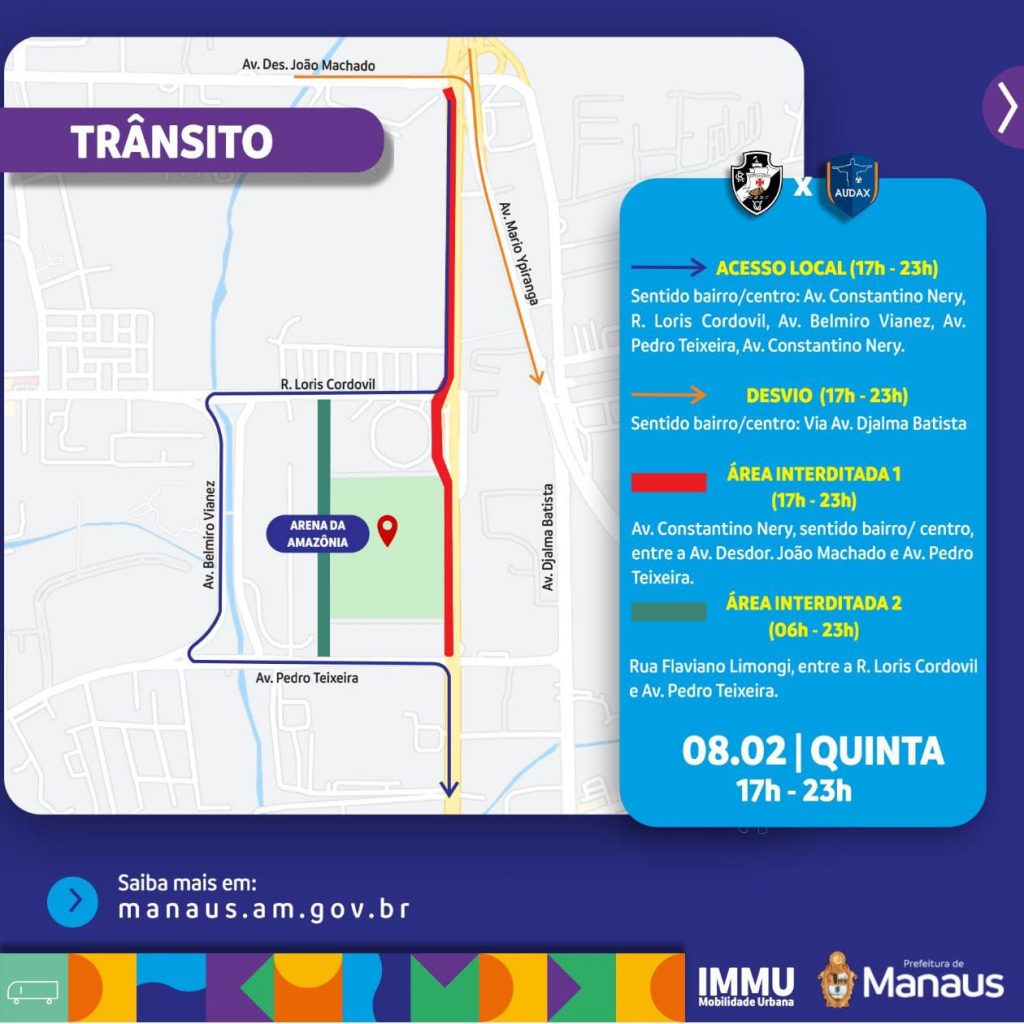 Bola no pé e comodidade aos torcedores serão as palavras de ordem do jogo programado para esta quinta-feira (8), na Arena da Amazônia entre os times Vasco da Gama x Audax, pela sétima rodada do Campeonato Carioca. O Instituto Municipal de Mobilidade Urbana (IMMU), montou uma operação especial para que os torcedores cheguem com segurança ao local do espetáculo futebolístico.