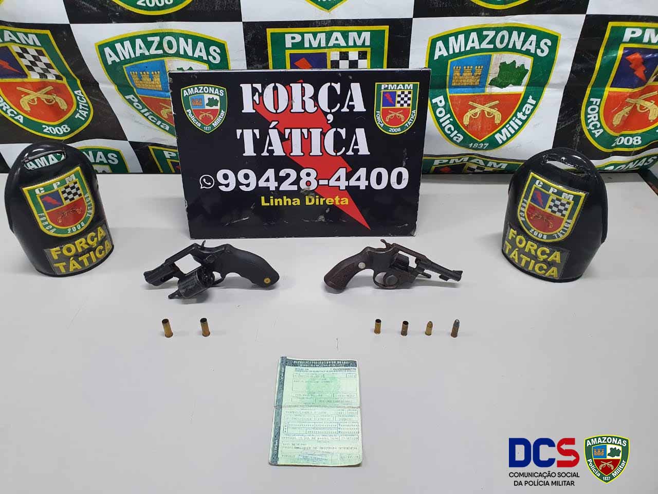 Policiais das Rondas Ostensivas Cândido Mariano (Rocam) prenderam dois homens, de 37 e 39 anos, na rua D, bairro Lírio do Vale 2, zona oeste da capital, após denúncias anônimas. Durante a revista pessoal, foram apreendidos um revólver calibre 32, três munições intactas, um quilo de cocaína, 16 porções de entorpecentes, R$ 1.920 em espécie e duas balanças de precisão.
