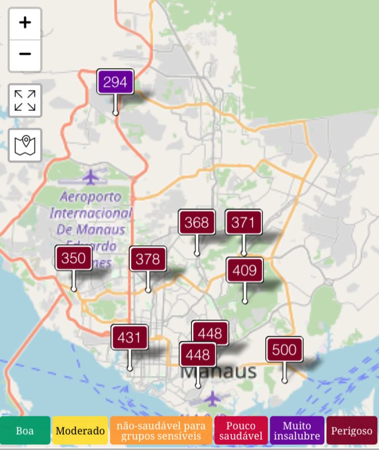 Nesta quarta-feira (11), a cidade Manaus amanheceu mais uma vez encoberta por fumaça de queimadas. As plataformas ‘The World Air Quality’ e o Sistema Eletrônico de Vigilância Ambiental (Selva), apontam que a qualidade do ar na capital péssima, muito insalubre e perigosa.